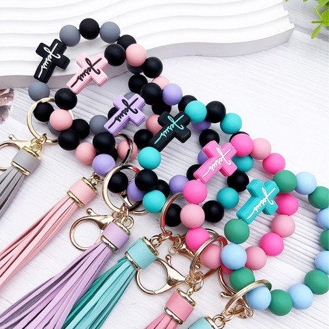 Großhandel Personalisierter Perlen-Schlüsselanhänger Luxuriöser Armband-Schlüsselanhänger mit Karabinerverschluss Silikon-Kreuzperlen und Quaste