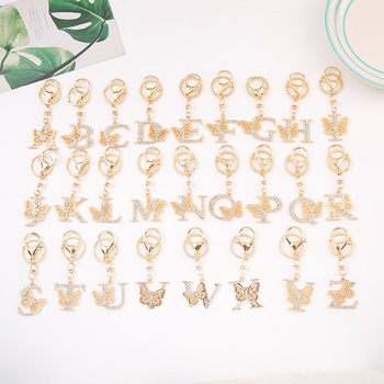 Venta al por mayor llavero personalizado moda lujo lindo diamante Bling Rhinestone mariposa letras alfabeto llavero de Metal