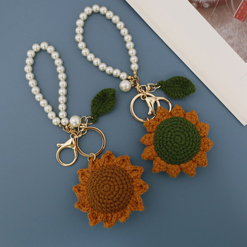 थोक कस्टम कीचेन प्रचार उपहार लक्जरी मोती रिस्टलेट लॉस्टर क्साप सूरजमुखी बुना हुआ क्रोकेट हैंडमेड कीचेन