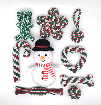 थोक कस्टम पालतू कुत्ते खिलौने टिकाऊ लक्जरी स्क्वीकी प्लग बेल स्नोमैन कपास रस्सी इंटरैक्टिव क्रिसमस पालतू कुत्ते चउ खिलौने सेट